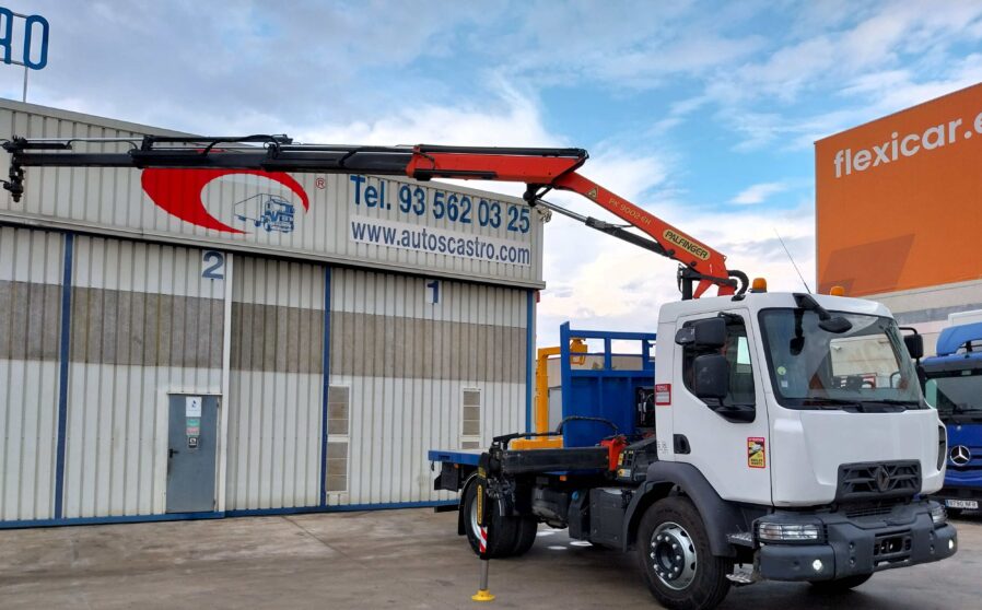 Camión grúa Renault D16 250 4×2 de 02/2017 con 305.000 km. EURO 6. Motor de 250 cv con cambio manual de 8 vel. Suspensión mecánica de ballestas. Grúa Palfinger PK9002-EH con 3 salidas. Año 2017. Mando radiocontrol disponible. Caja abierta plataforma. Longitud de 3.70 m.