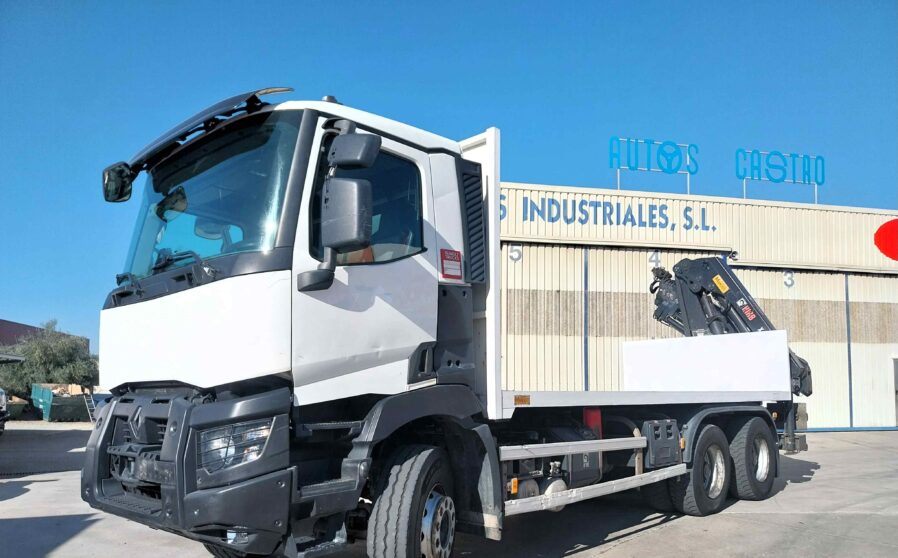 Camión grúa de ocasión Renault C430 6×4 de 10/2014 con 394.000 km. EURO 6. Motor de 430 cv con cambio automático de 12 vel. Suspensión mecánica de ballestas. Grúa HIAB X HIDUO 188 con mando radiocontrol. Plataforma sin laterales con medidas: 6,10 x 2,55 m.